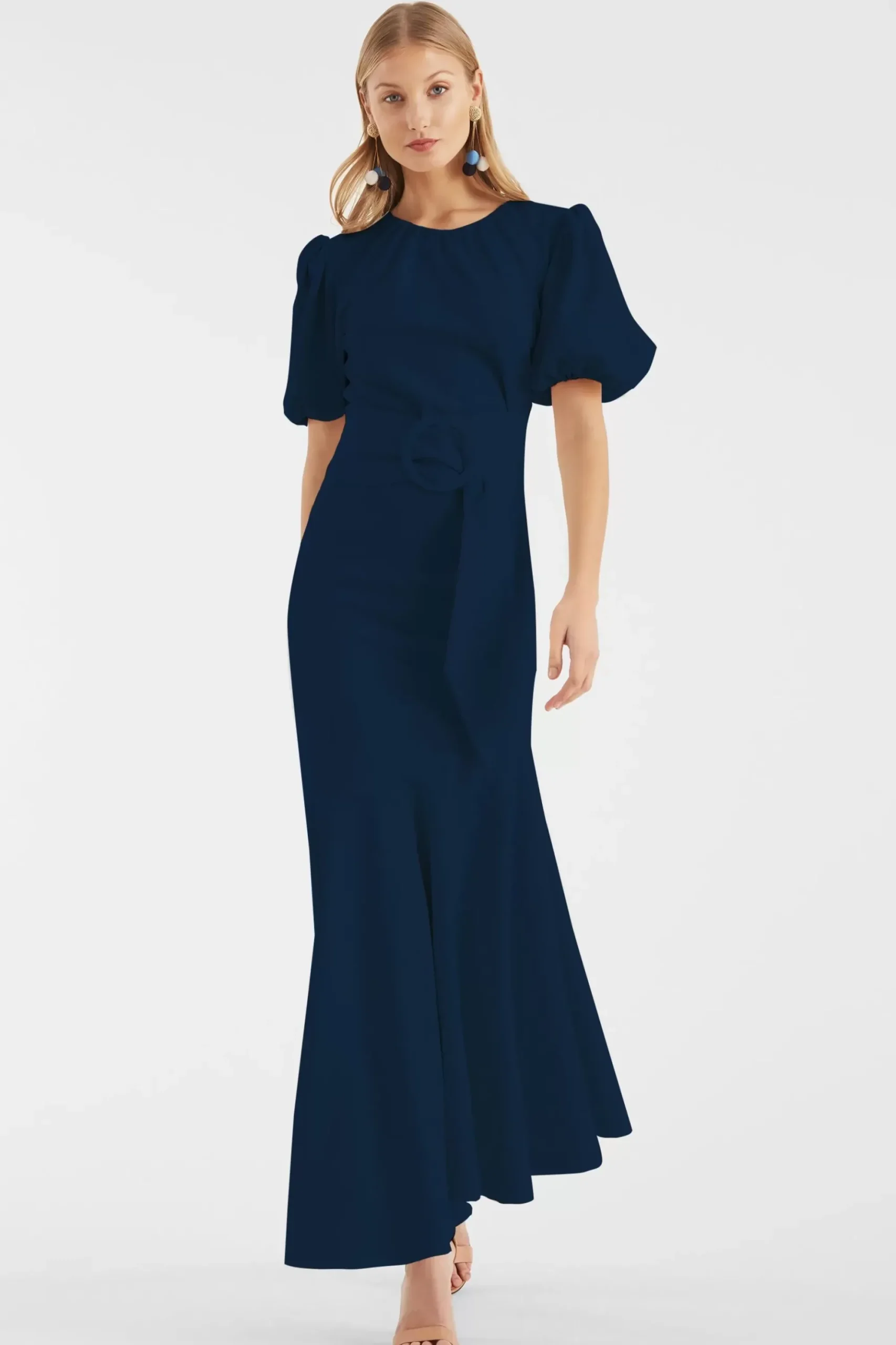 The Camilla Dress In Crepe Is A Modified Mermaid Silhouette Perfect For Day To Evening. Ruching At The Jewel Neck Creates A Subtle Blouson, And The Bodice Features A Self-Belt With Hand Wrapped Buckle. Ruching Is Also Seen At The Side To Hug The Hip, Falling Away From The Body With A Fluid Asymmetric Hem.