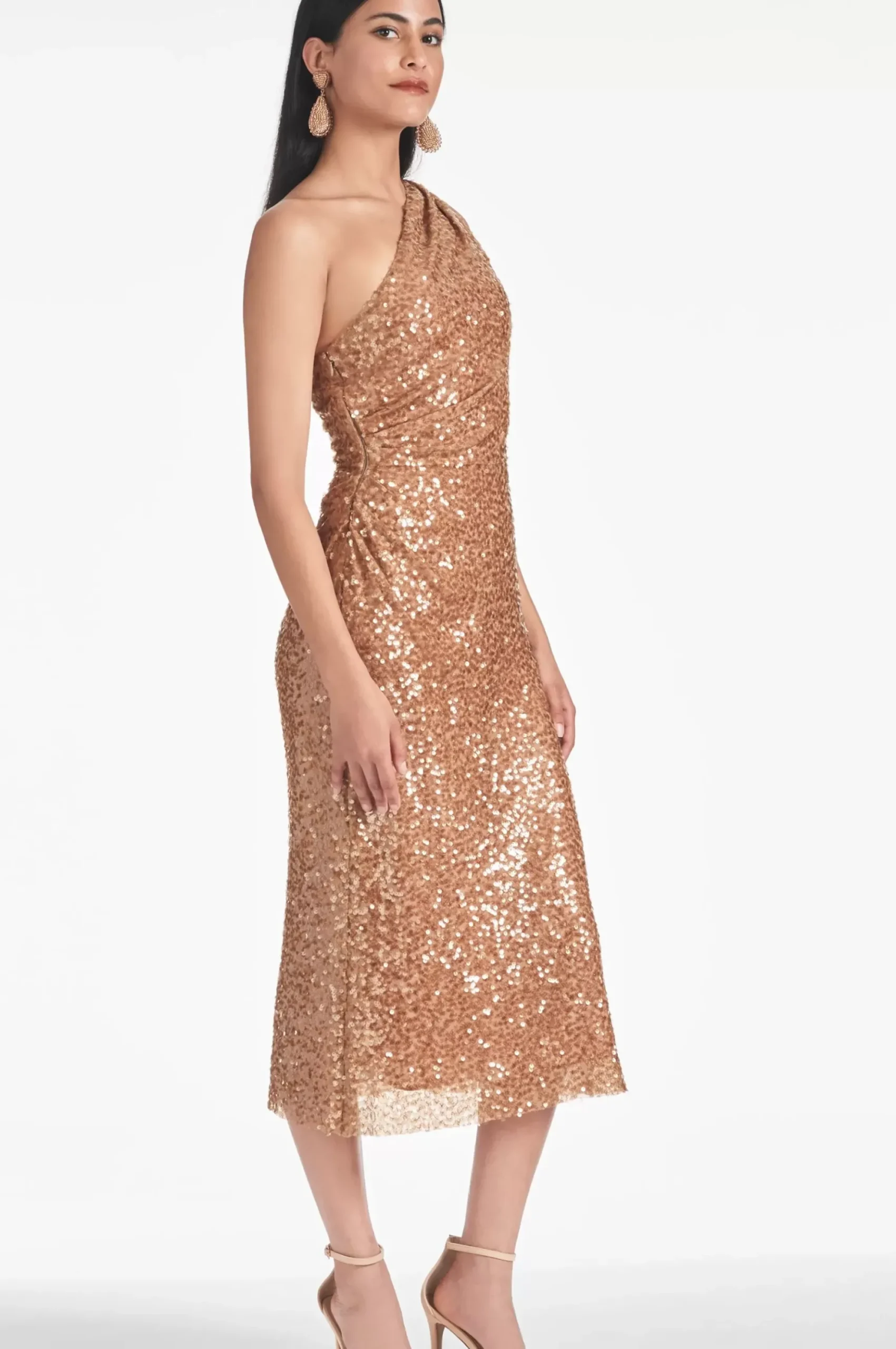 Look And Feel Amazing In The Carmen Dress! This One Shoulder Design Sparkles In A Beautiful Honey, Making It A Perfect Choice For Any Fun Or Festive Occasion. The Mid-Length Honey Hued Dress In Stretch Sequin Fabric Ensures A Comfortable And Stylish Fit – You’Ll Love The Confident Feeling You Get While Wearing It!