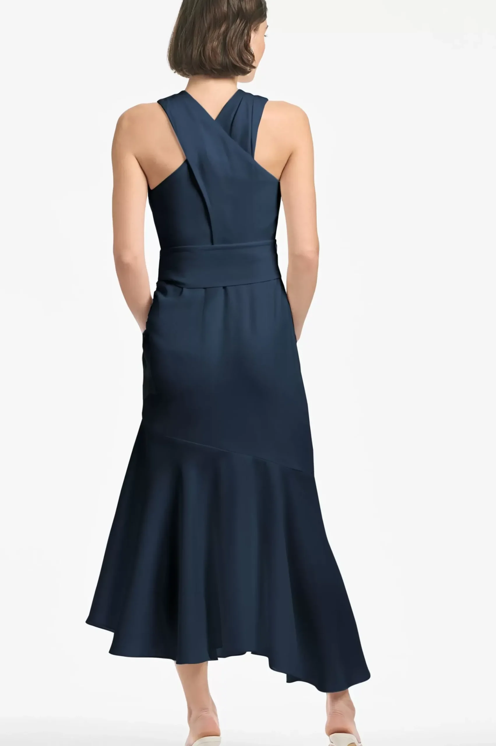 The Naomi Dress In Crepe Is A Modified Mermaid Silhouette In Midnight. The Halter Neckline Opens Up The Decolletage Creating A Subtly Elegant Silhouette, Ruching Is Also Seen At The Side To Hug The Hip, Falling Away From The Body With A Fluid Asymmetric Hem. The Bodice Features A Self-Belt With Hand-Wrapped Buckle.