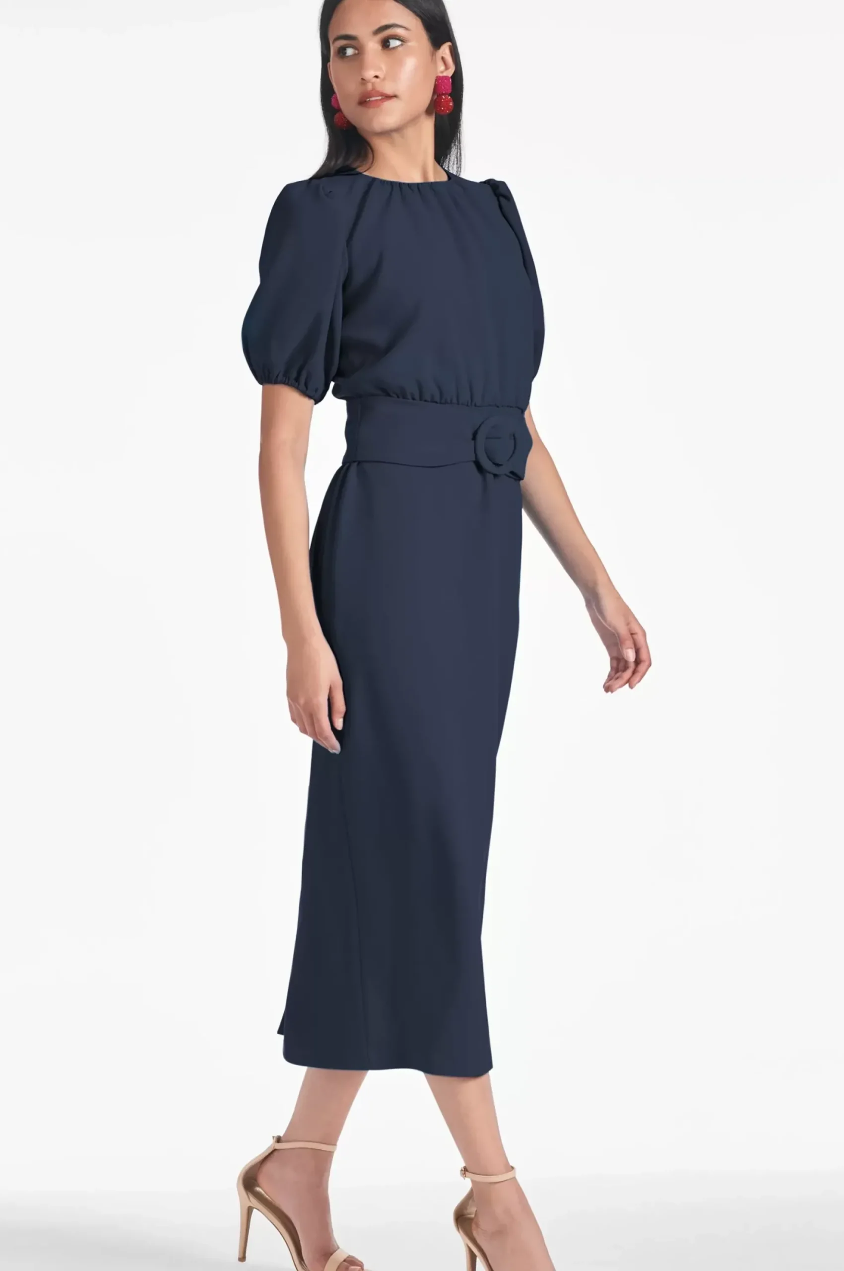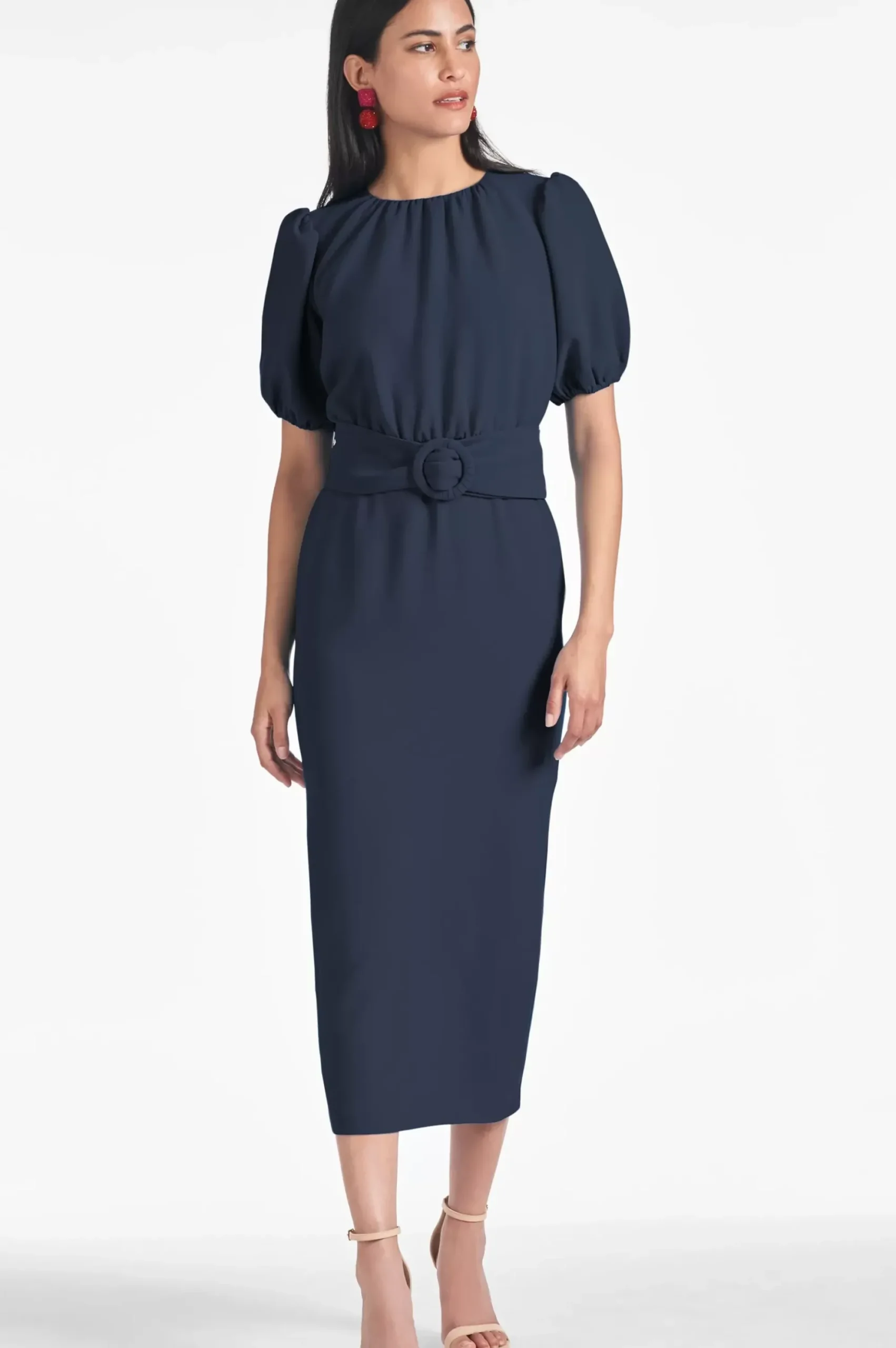 Featuring A Fitted Bodice, Puff Sleeve, And An Added Belt, This Dress Is Tailored To Hug Your Curves And Flatter Any Figure. The Dark Midnight Color Lends A Clean Finish To The Classic Look.
