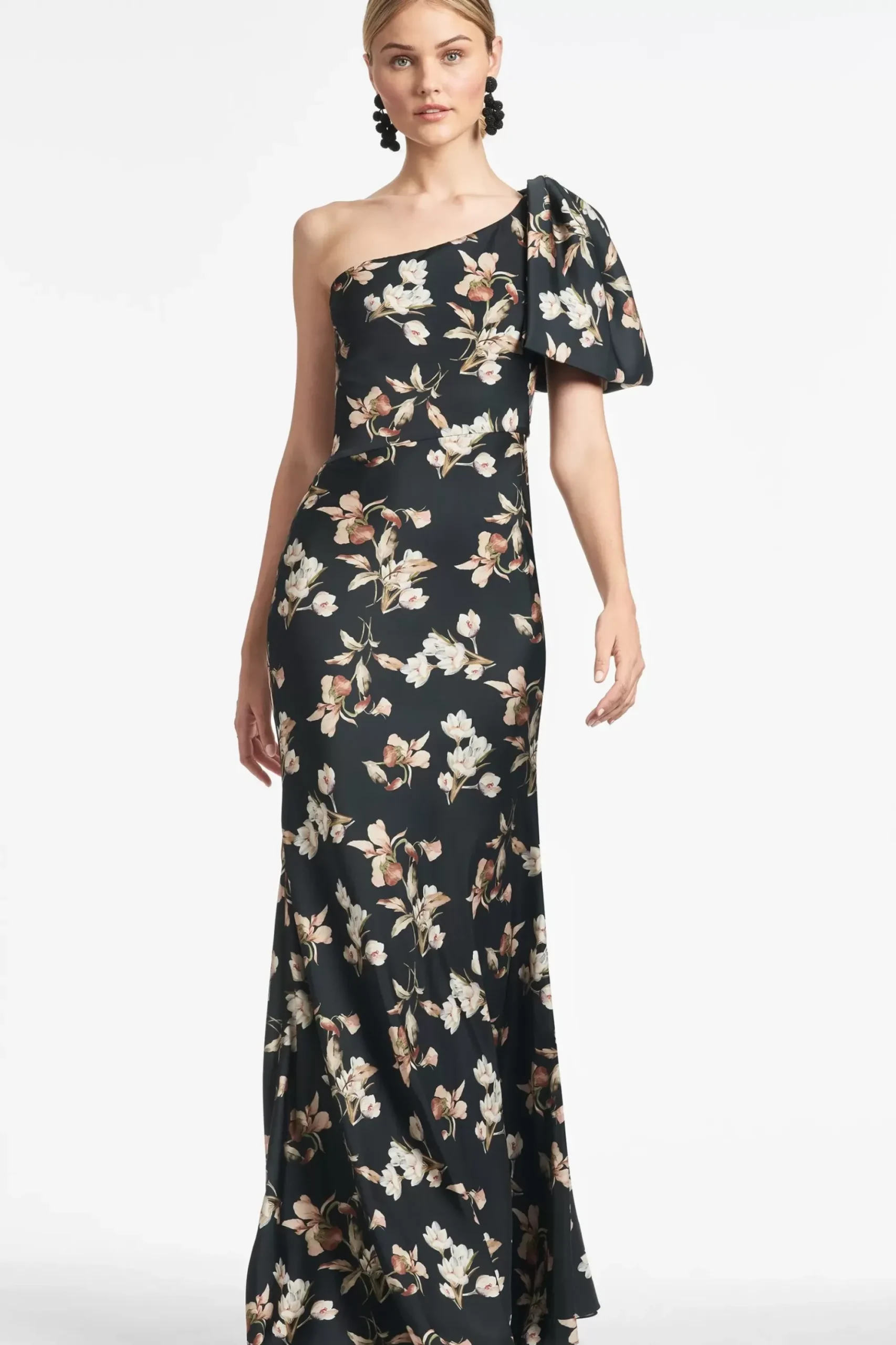 The Aubrey Gown In Black Venetia Petal Print Is An Example Of Balance By Design. A Sleek Sleeve Of Charmeuse Cut On The Bias With An Asymmetric Seam At The Waist Creates A Column For Curves. At The Shoulder Sits A Hand Tucked Collapsed Bow Adorned With Hand-Embroidered Silver Caviar Beading At The Knot.