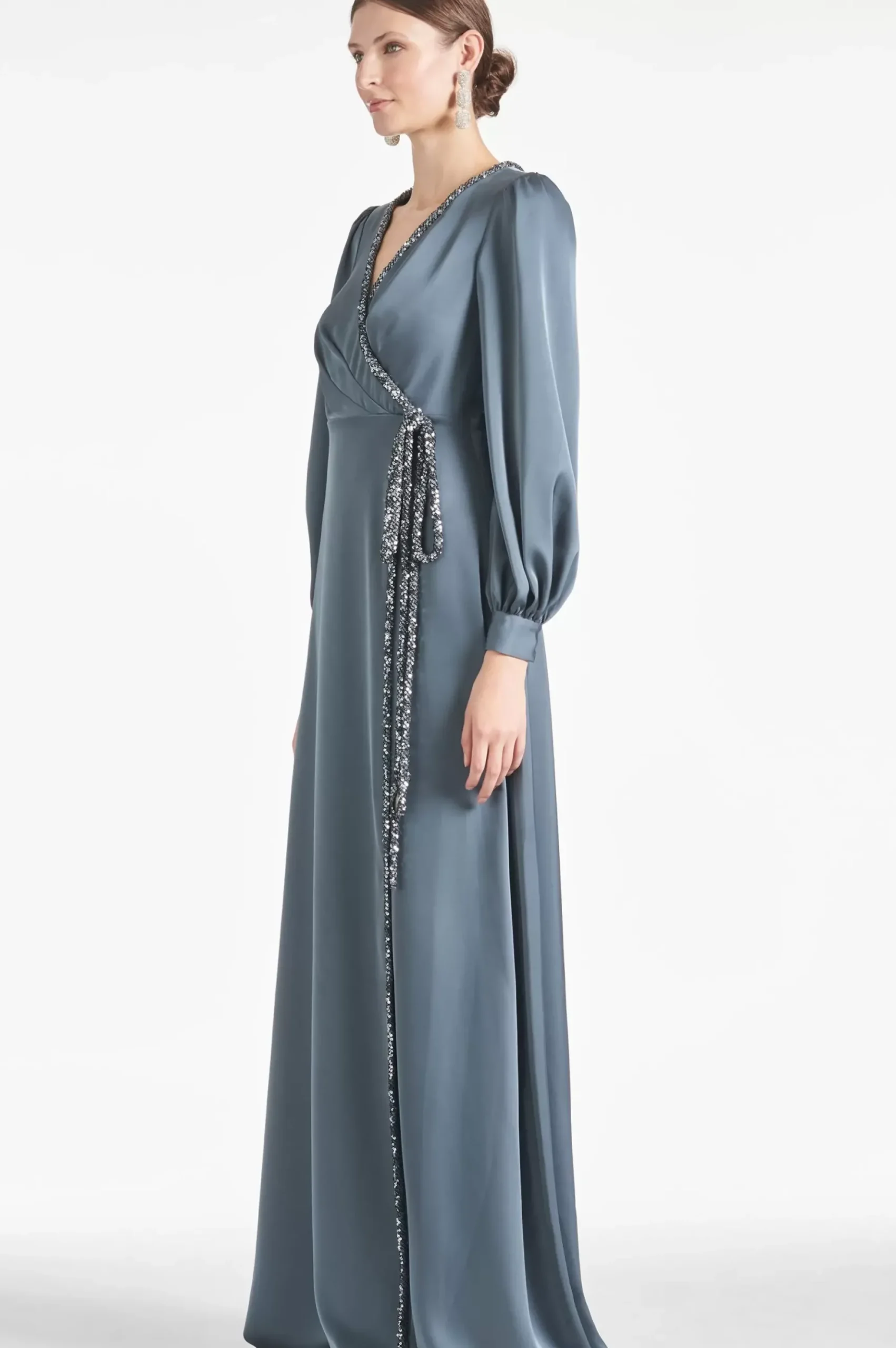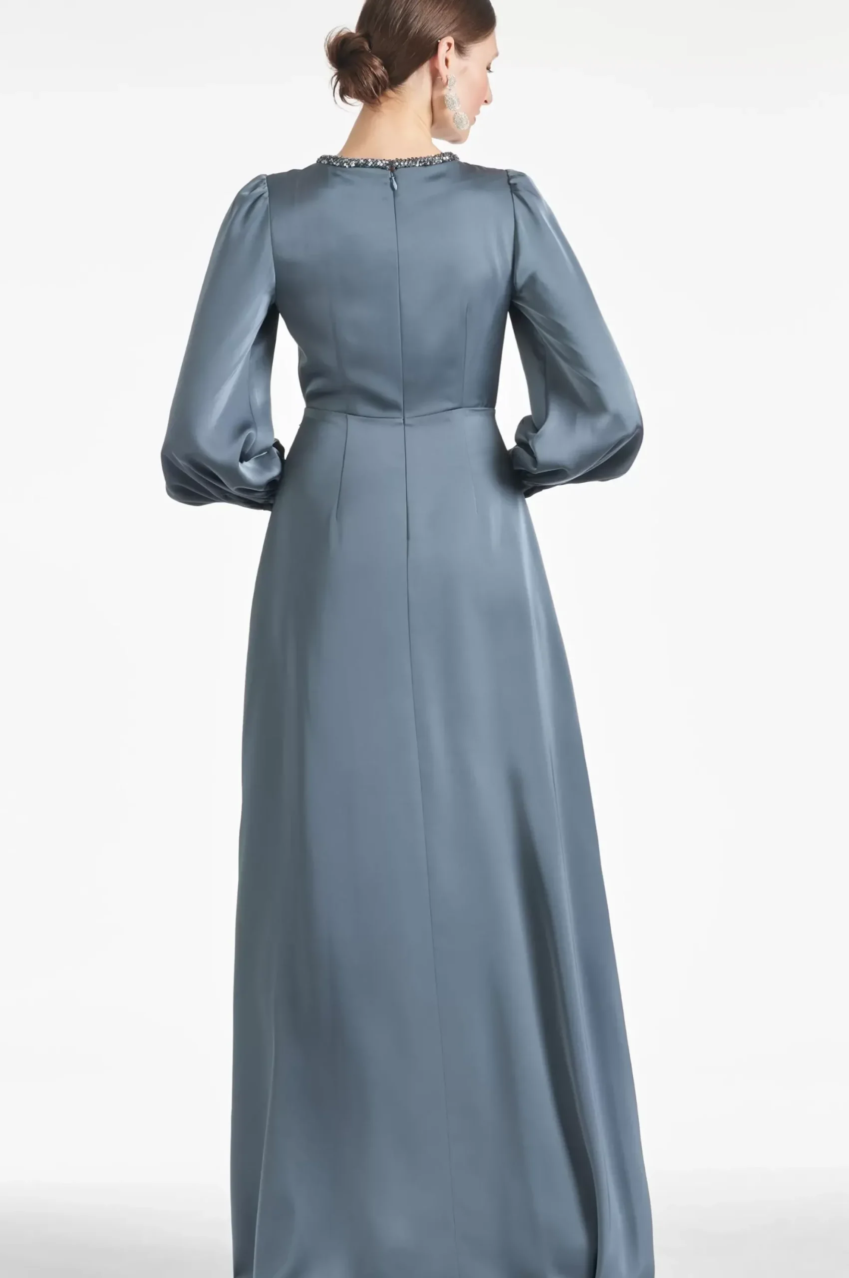 The Dorthea Gown Is A Stunning Gunmetal A-Line Gown With Subtle Sparkle Accents. Crafted From A Soft Satin Crepe Fabric, The Gown Features Long Sleeves And An Elegant Drape For The Ultimate Sophistication At Any Event.