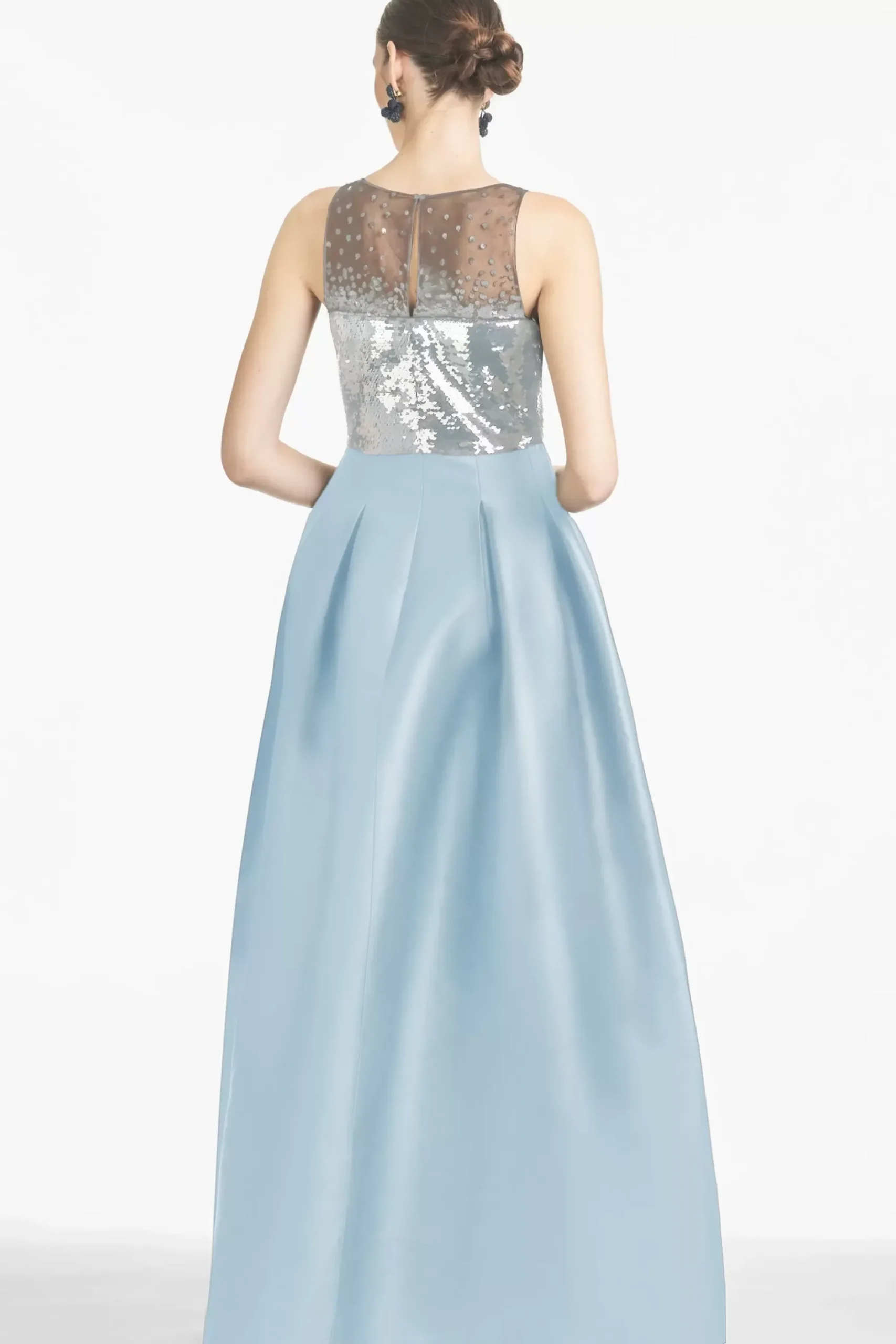 The Erica Is An Elegant Gown Dressed In Sequins. The V-Neck Bodice Of The Dress Is Lit With Silver Sequins, And The Ash Blue-Colored Mikado Skirt With Center-Front Slit Is Both Grand And Elegant.
