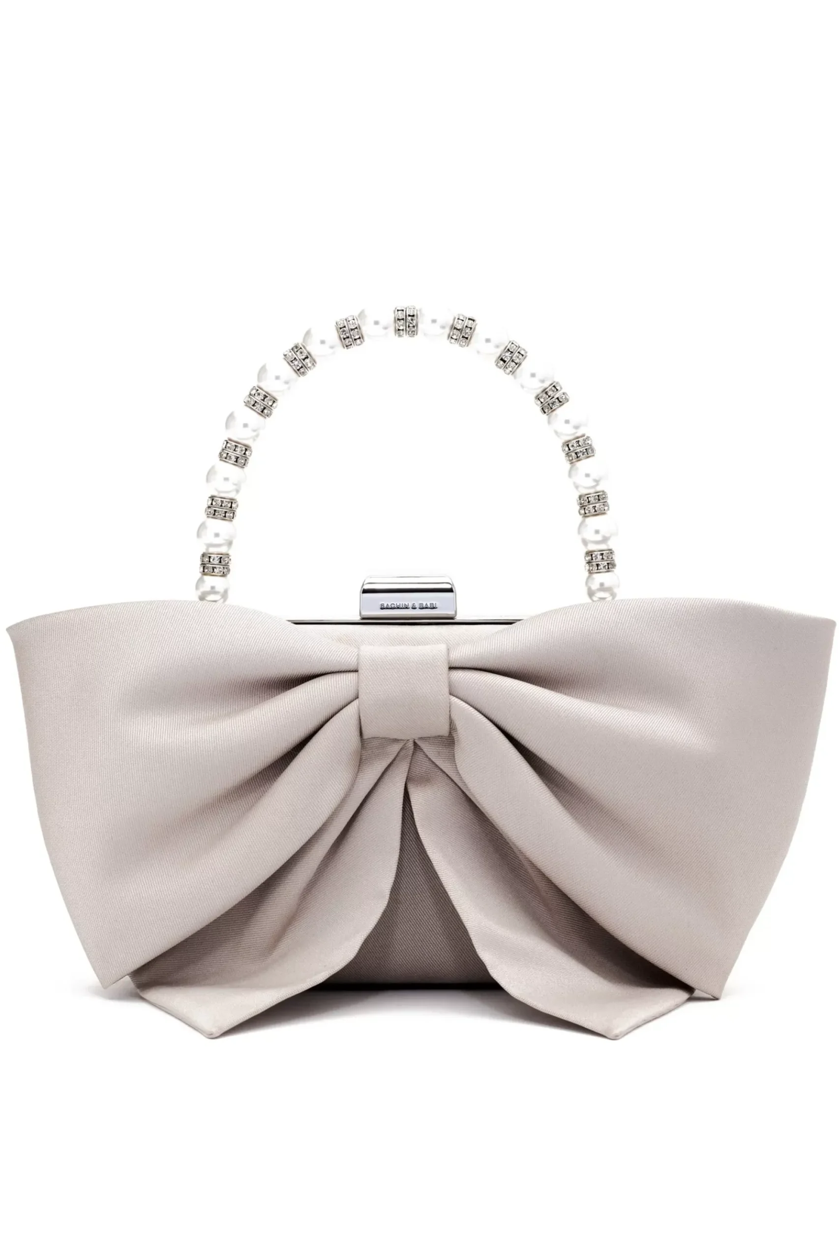 Introducing The Bubbly Bag, Inspired By Exactly What You Would Imagine. This Fully-Framed Evening Bag Features A Silver Tone Finish, An Interior Pocket, And A Removable Chain With Top Closure. Its Rich Mikado Fabrication Lends Itself To Luxury, While The Pearl And Crystal Embellished Top Handle Speaks To A Timeless Sophistication Making It The Perfect Companion To Any Fete.