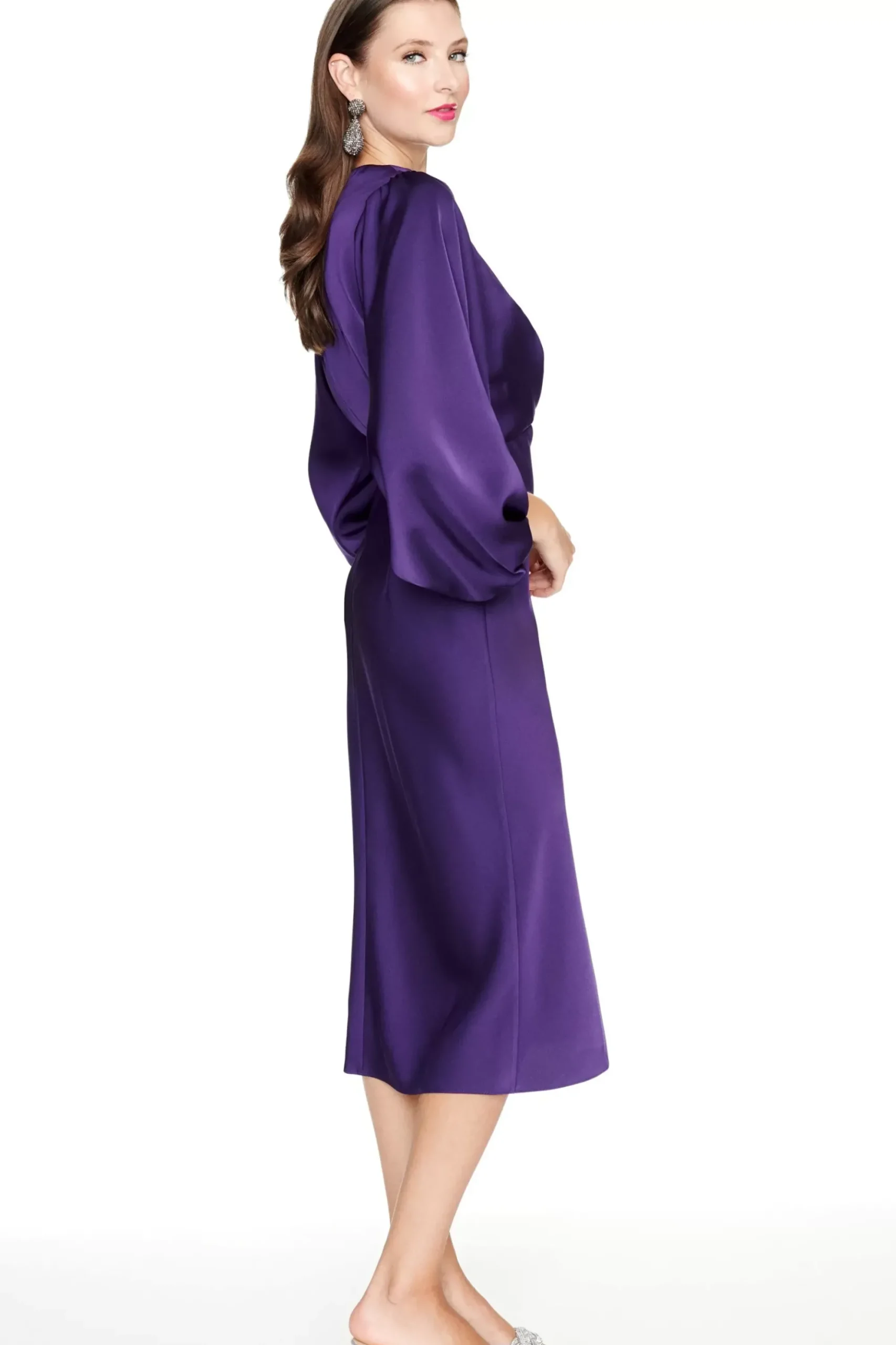 The Ginny Dress Is Simply Perfect. She Is The Little Sister Of Our Best Selling Jenny Gown, Only Shorter. This Dress Is The Definition Of Day To Dinner. The Amethyst Color Is Made From Satin Crepe And Features Long Sleeves For Extra Coverage. The Perfect Length Allows For Movement And Comfort.