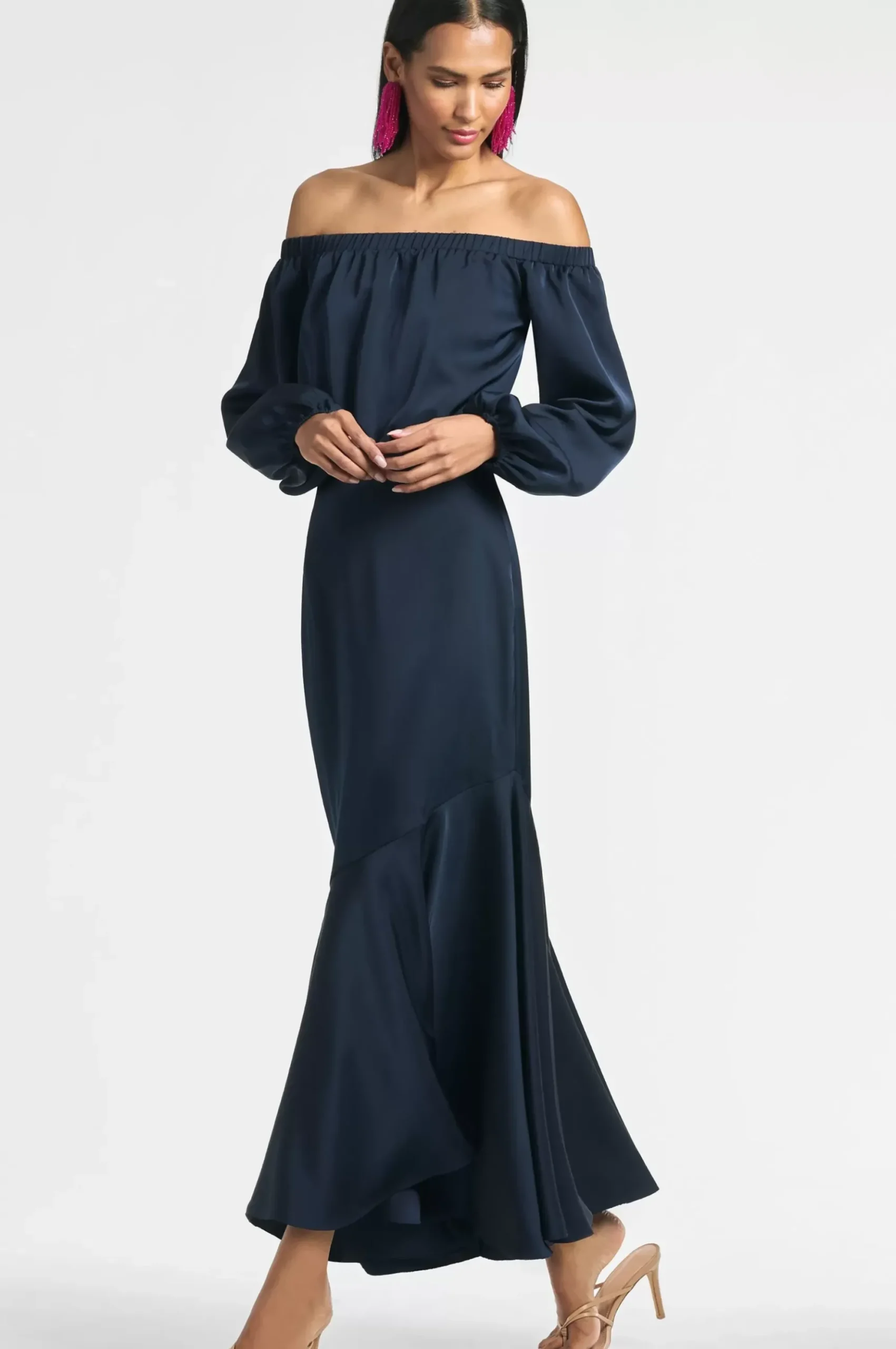 The Kai Dress In Satin Back Crepe Is A Modified Mermaid Silhouette Perfect For Day To Evening. A Ruched Off The Shoulder Dress Has A Subtle Blouson, And The Bodice Features A Self-Belt With Hand Wrapped Buckle. Ruching Is Also Seen At The Side To Hug The Hip, Falling Away From The Body With A Fluid Asymmetric Hem.