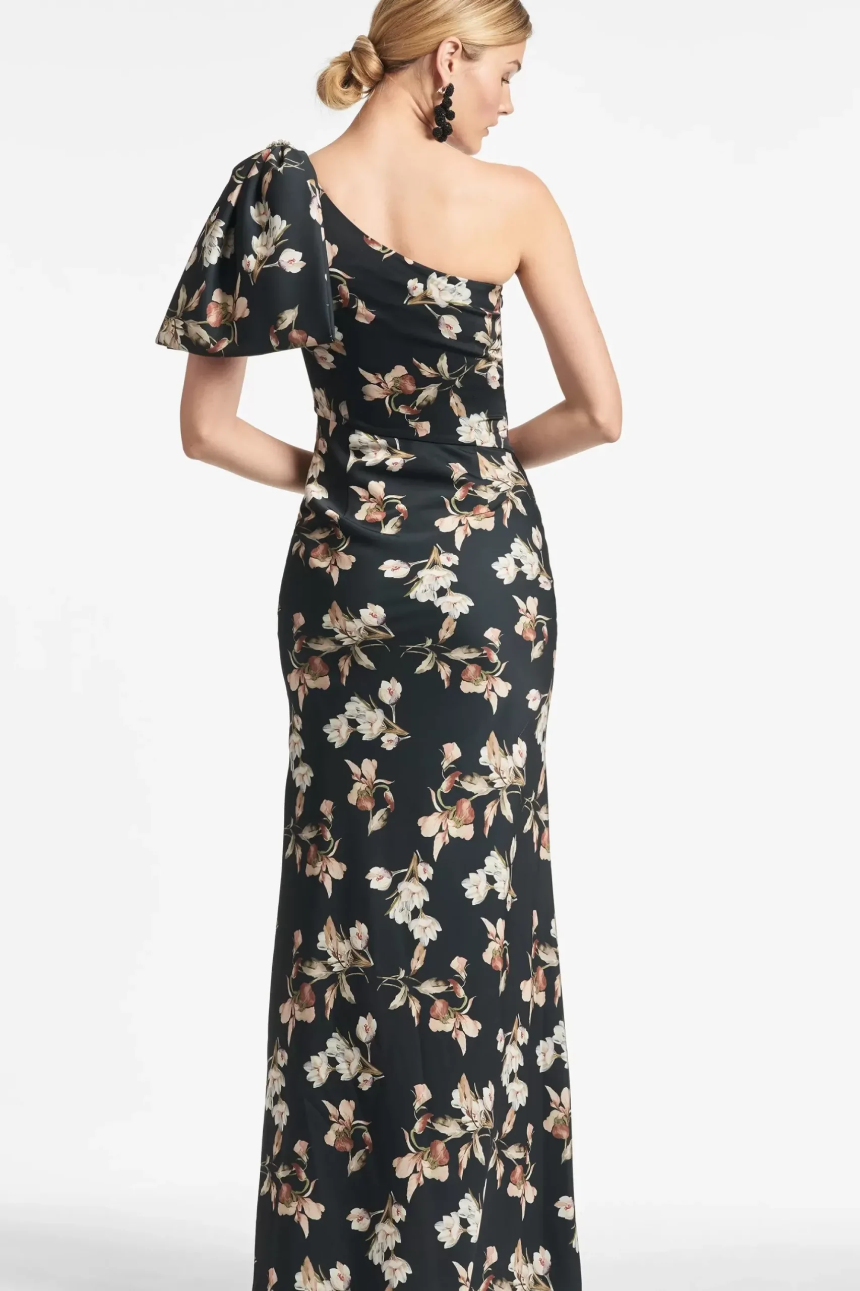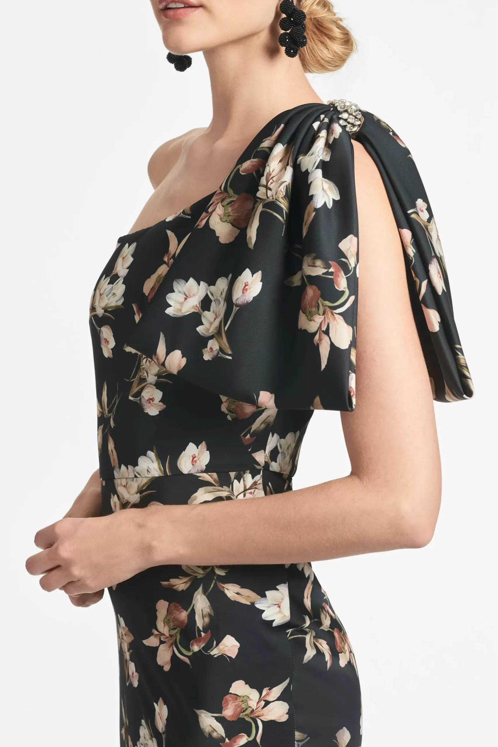 The Aubrey Gown In Black Venetia Petal Print Is An Example Of Balance By Design. A Sleek Sleeve Of Charmeuse Cut On The Bias With An Asymmetric Seam At The Waist Creates A Column For Curves. At The Shoulder Sits A Hand Tucked Collapsed Bow Adorned With Hand-Embroidered Silver Caviar Beading At The Knot.