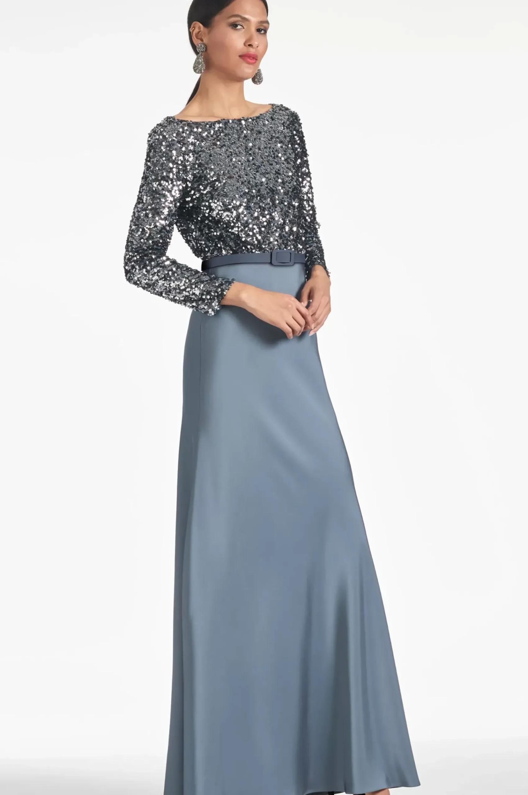 Turn Heads In The Exquisite Colette Gown. Gleaming With Gunmetal Sequins To Create A Beautiful Sparkle, While The Satin Crepe Fabric Forms A Figure-Flattering Silhouette To Shine. Sleeves And Front Coverage To Provide A Touch Of Modesty, While A Draped, Open Back Adds The Drama.