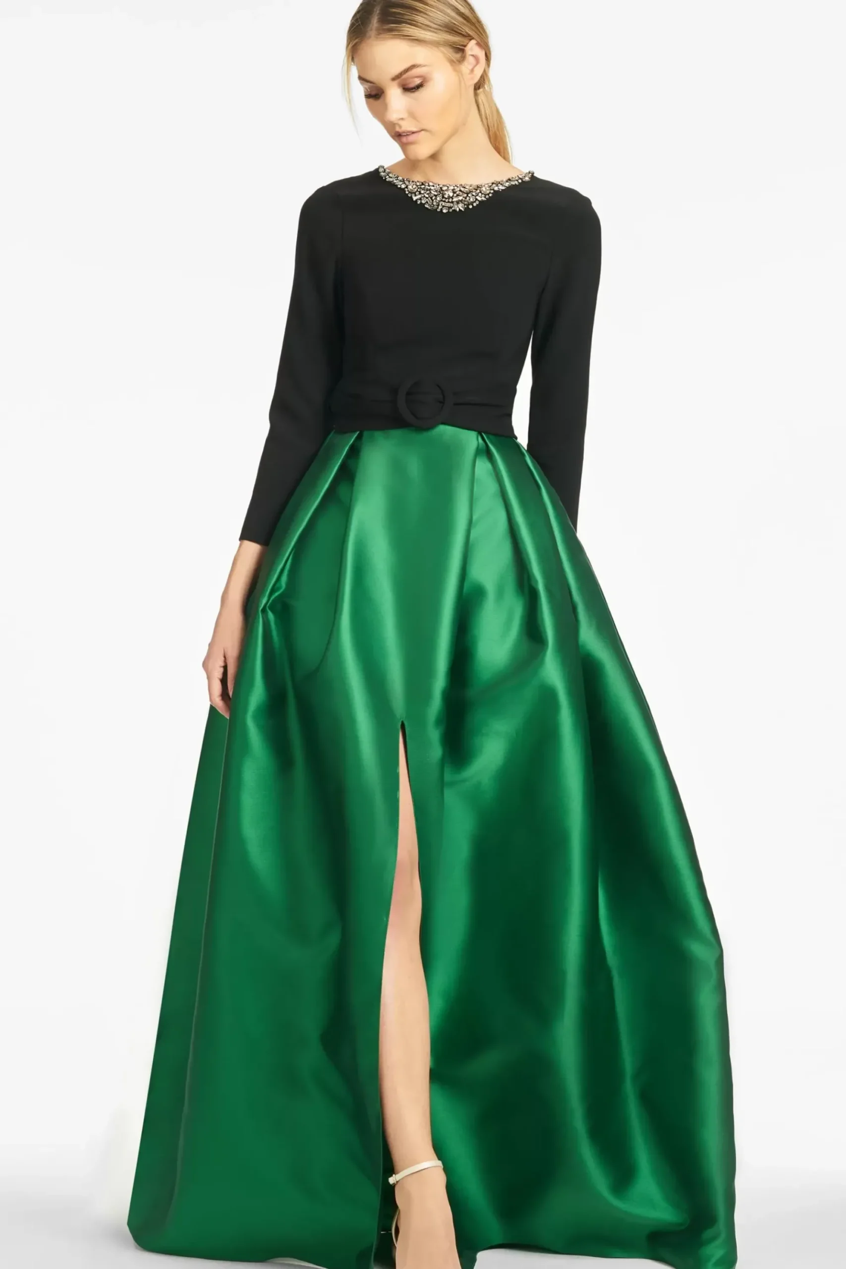 Elegant. Grande. Gorgeous. These Are All The Words That Come To Mind When We Look At This Classic Ball Down. What We Really Love About This Dress, Which Is Everything, If We Had To Highlight Something, It Would Be The Bodice. The Jet Black Top Of This Dress Is In Our “Magical” 4-Way Stretch Crepe That Flatters And Hugs You While Being Incredibly Comfortable. At The Neck, A Faceted Bib Necklace, And At The Waist A Self-Tie Sash. The Skirt Is A Flash Of Intensely Stunning Color In Mikado.