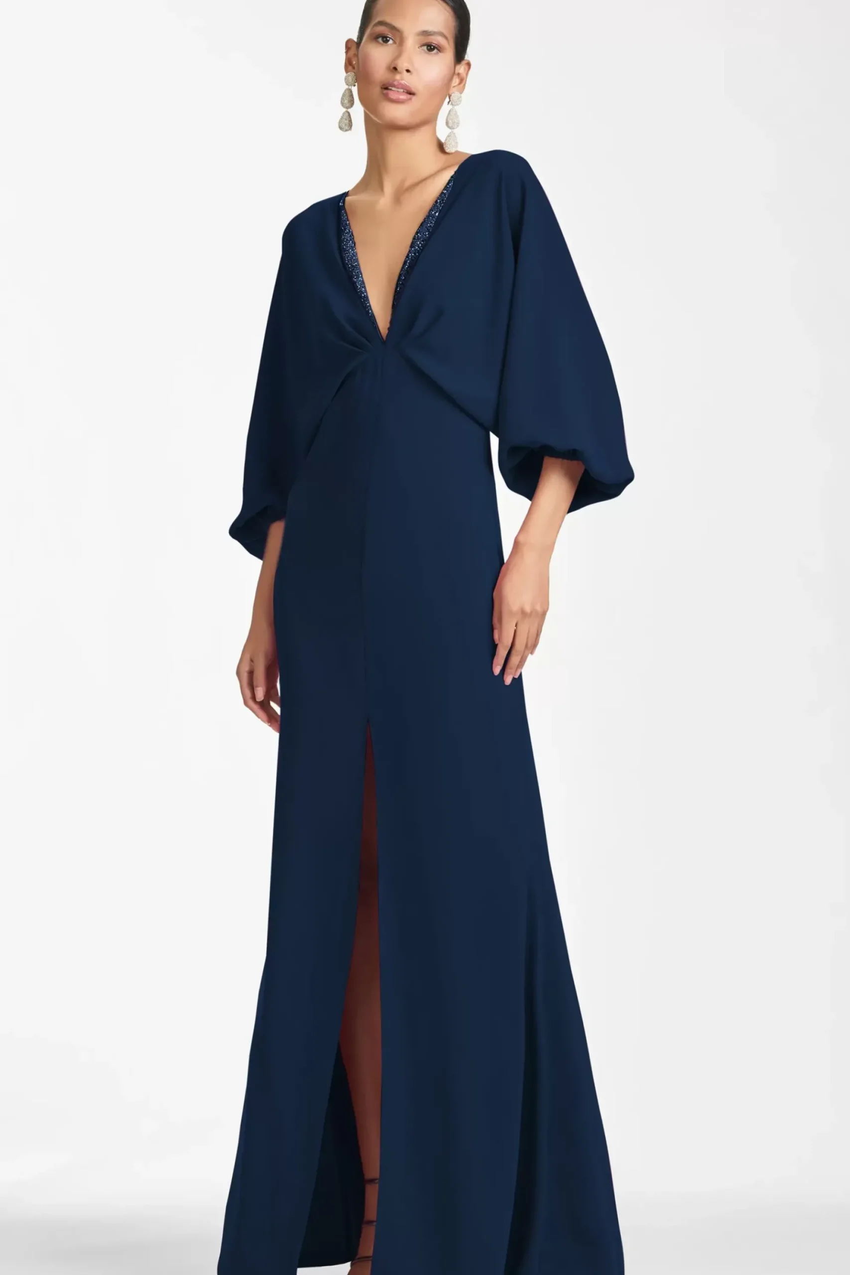 Looking For Something Chic? A Dress That Elongates Like A Column But Glides Over The Body In An A-Line, This Dress Is Effortless. There Is A Bit Of 40’S Era Glamour That Never Leaves The Fashion Lexicon. Let Us Not For Get The Tonal Glittering Trim That Traces The Plunging V.