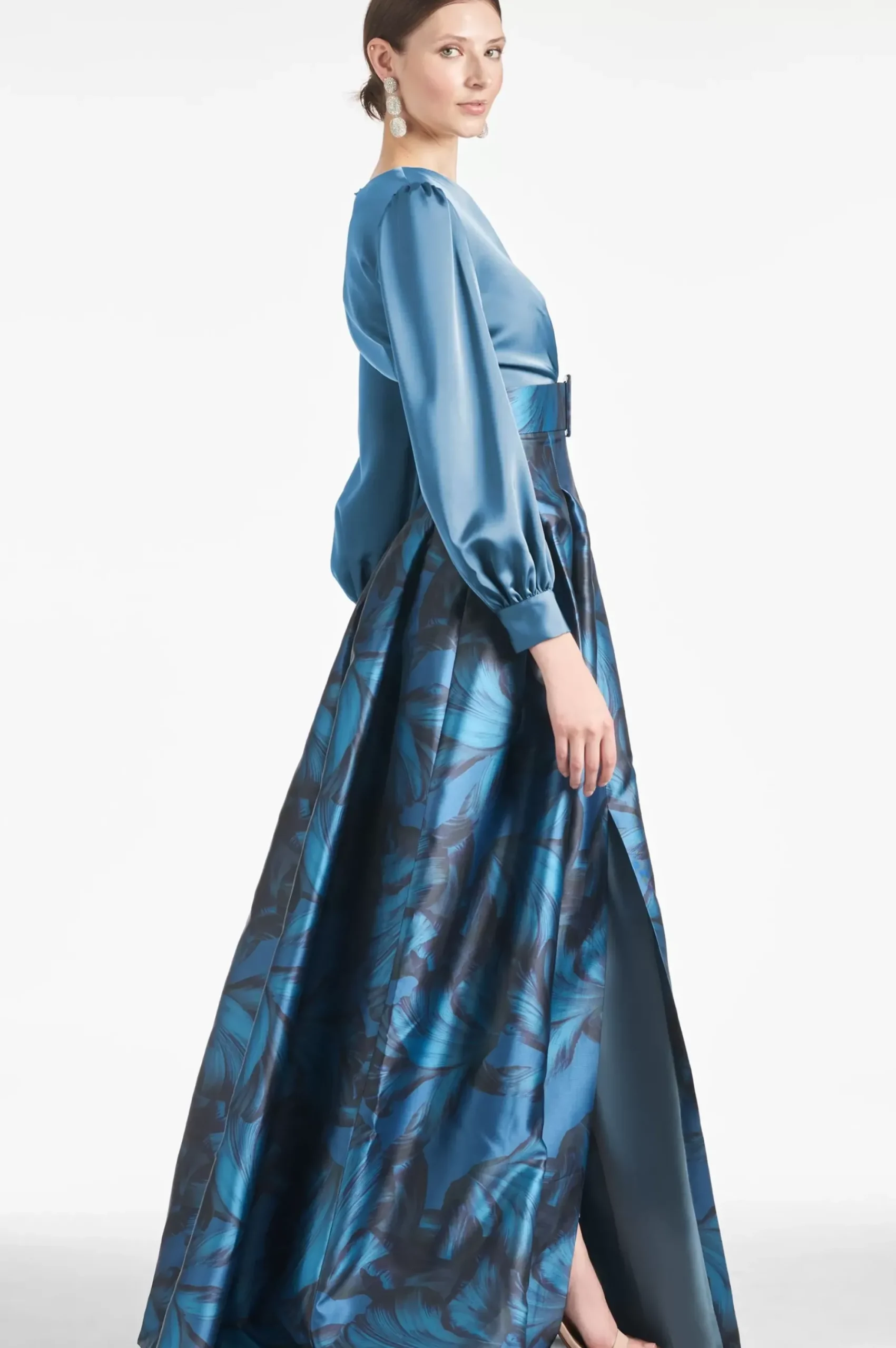 The Zoe Gown Is The “Grande Dame” Of The Occasion. The Deep V-Neck Smokey Slate Satin Crepe Bodice Meets The Printed Mikado Self-Belt To Join The Classic Ball Skirt With Its Soft, Box Pleating. At The Front A Discreet, But Still Dramatic, Front Slit And At Each Side A Side Slit Pockets.